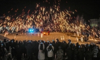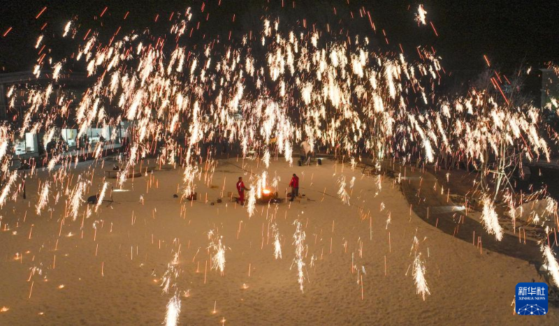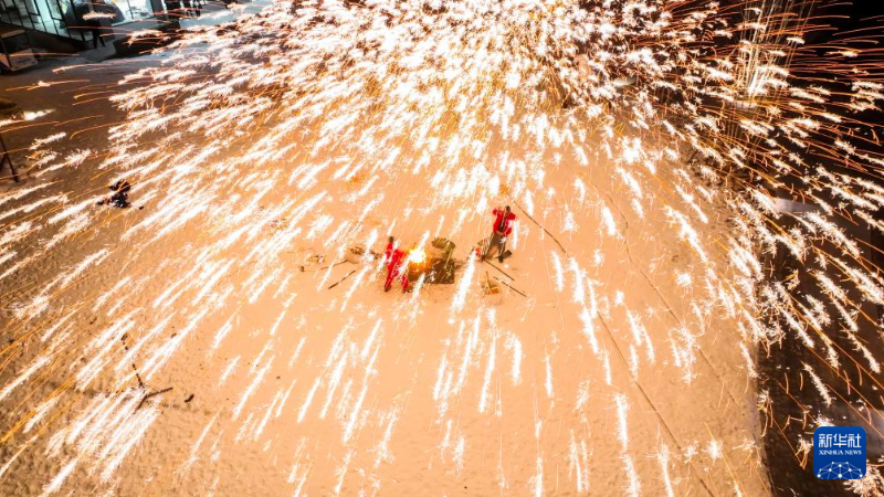 1月13日,民間藝人在河北省承德市興隆縣一景區(qū)為游客表演“打樹(shù)花”(無(wú)人機(jī)照片)。