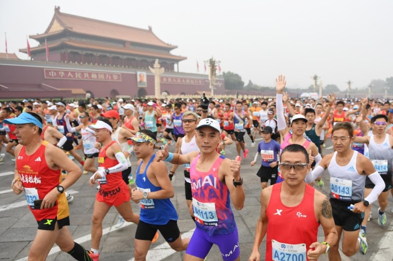 2023年10月29日,2023北京馬拉松參賽選手奔跑在長(zhǎng)安街上。新華社記者 鞠煥宗 攝