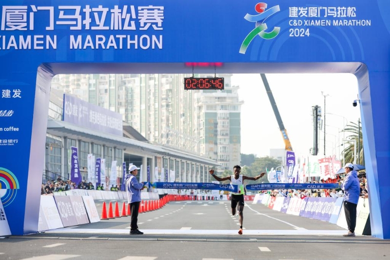 1月7日,埃塞俄比亞選手凱碧貝在廈馬比賽中沖過(guò)終點(diǎn)線。新華社發(fā)(廈門馬拉松賽事組委會(huì)供圖)