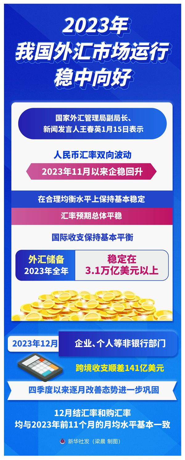新華社北京1月15日電(記者劉開雄)“2023年我國外匯市場運行穩(wěn)中向好、表現出較強韌性?!眹彝鈪R管理局副局長、新聞發(fā)言人王春英15日表示,人民幣匯率雙向波動,2023年11月以來企穩(wěn)回升,在合理均衡水平上保持基本穩(wěn)定,匯率預期總體平穩(wěn);國際收支保持基本平衡,外匯儲備2023年全年穩(wěn)定在3.1萬億美元以上。