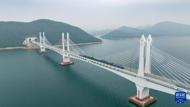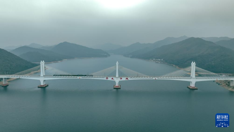 1月15日,檢測列車行駛在池黃高鐵太平湖特大橋上(無人機照片)。