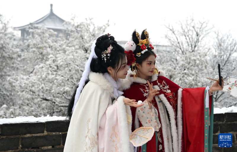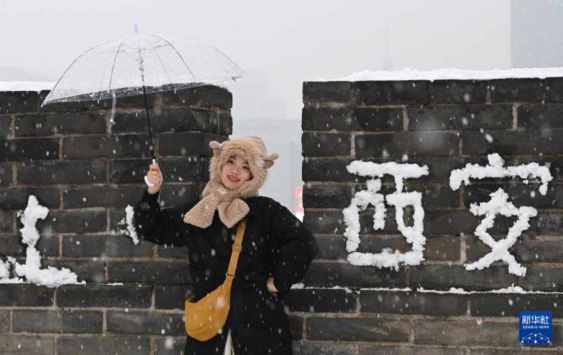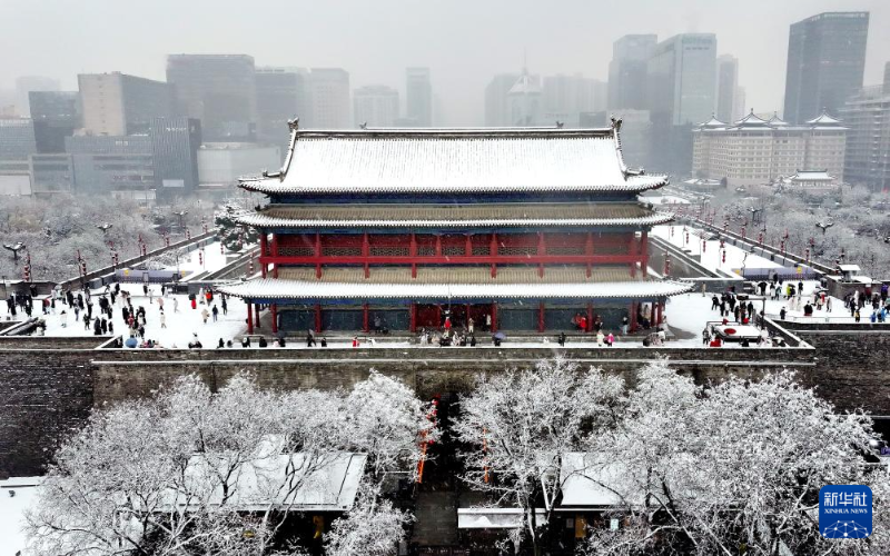 1月16日,游客在西安城墻觀景賞雪。