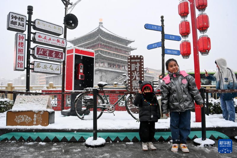 1月16日,游客在西安鐘樓賞雪合影。