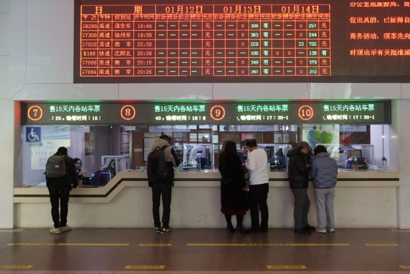 1月12日,春運火車票開始發(fā)售,旅客在南京火車站售票大廳通過售票窗口購買火車票。新華社發(fā)(史俊 攝)