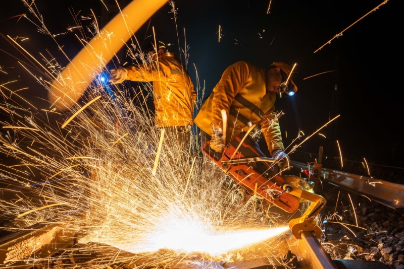 1月5日凌晨,在滬昆鐵路公坪至芷江西區(qū)間,鐵路工人使用切割機進行鋸軌作業(yè)。新華社記者 陳思汗 攝