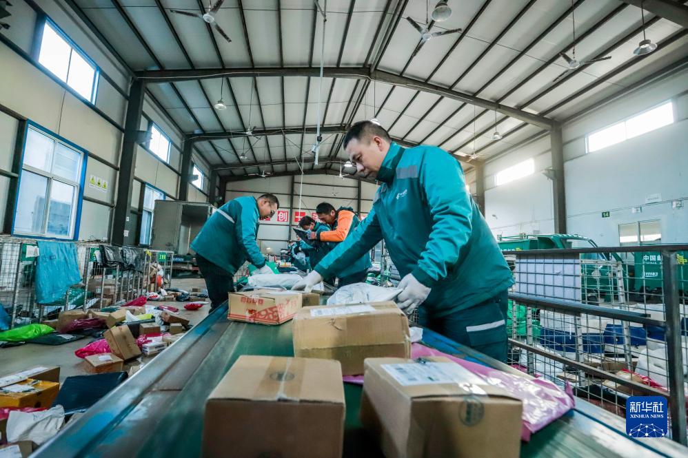 2023年11月9日,河北省遵化市郵政快遞公司的工作人員在車間分揀收寄的快件。(圖源:新華社)