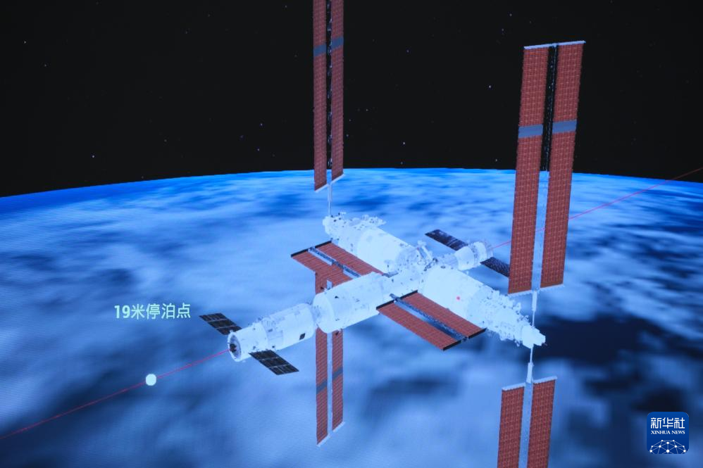 1月18日在北京航天飛行控制中心拍攝的天舟七號貨運飛船與空間站組合體進行交會對接的模擬圖像。(圖源:新華社)