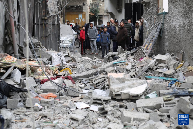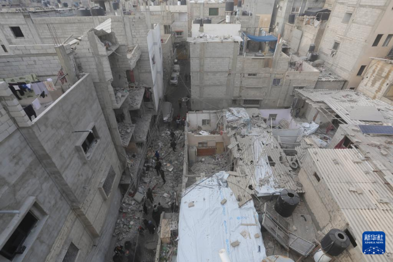1月17日,在加沙地帶南部城市拉法,人們查看以軍空襲后的受損建筑。