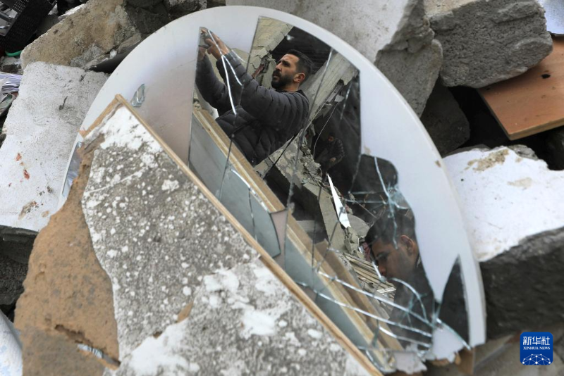1月17日,在加沙地帶南部城市拉法,查看以軍空襲后受損建筑的人們的身影倒映在破裂的鏡面上。