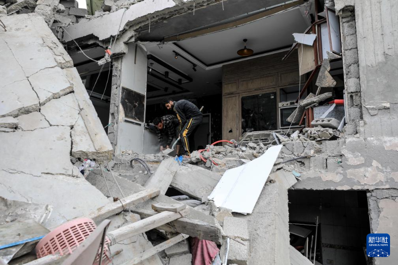1月17日,在加沙地帶南部城市拉法,人們清理一處在以軍空襲中受損的建筑。