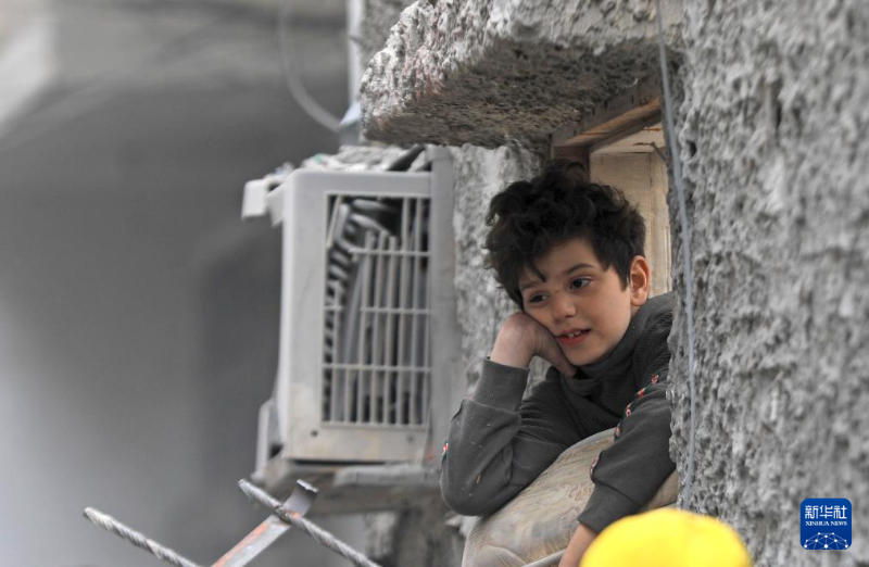 這是1月17日在加沙地帶南部城市拉法拍攝的在以軍空襲中受損建筑內(nèi)的兒童。