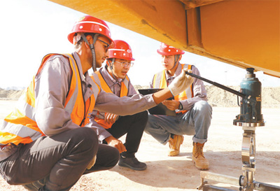 在阿布基爾集裝箱碼頭項(xiàng)目,中方員工向埃方新入職員工(左)講授級(jí)配碎石檢測(cè)知識(shí)。