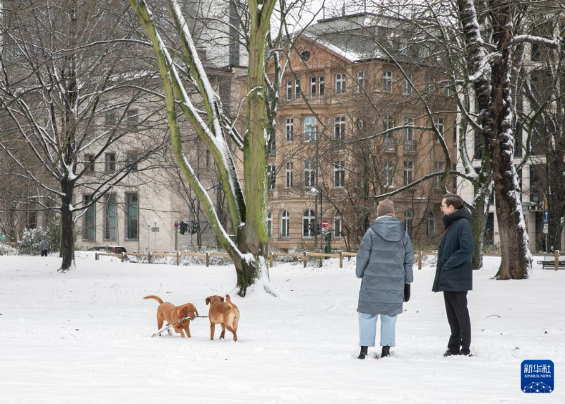 1月18日,在德國法蘭克福,人們帶著狗在大雪覆蓋的草坪上玩耍。