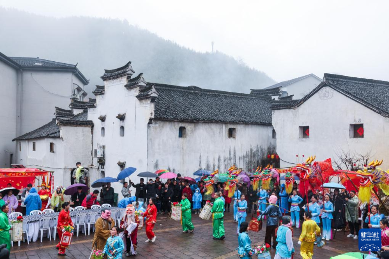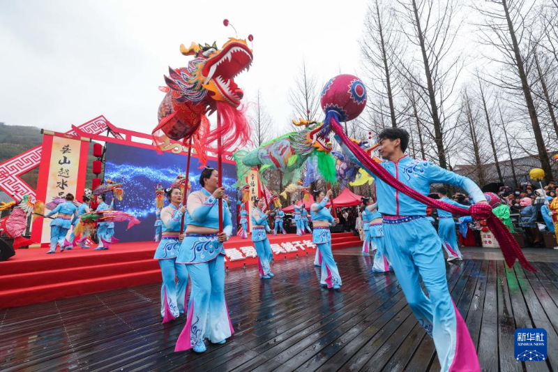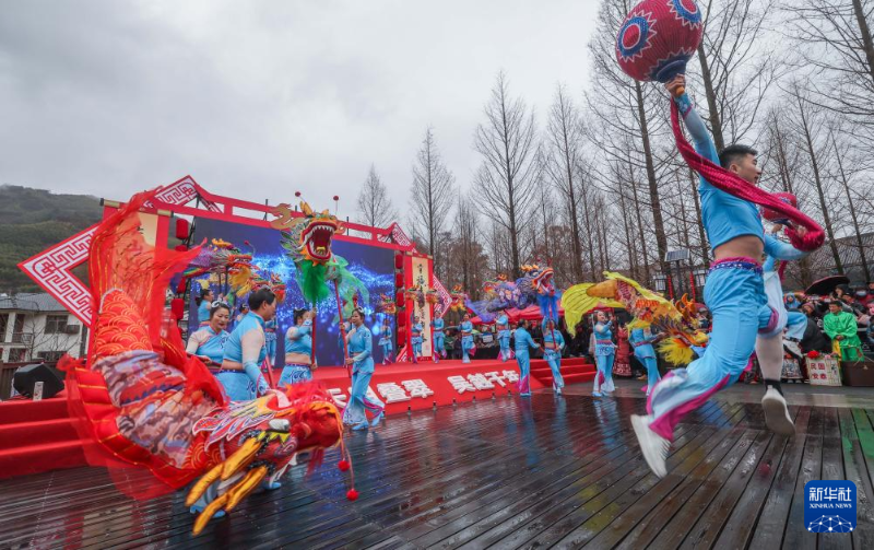 1月20日,演員在太湖源鎮(zhèn)指南村村落景區(qū)表演傳統(tǒng)舞龍踩街。新華社記者 徐昱 攝