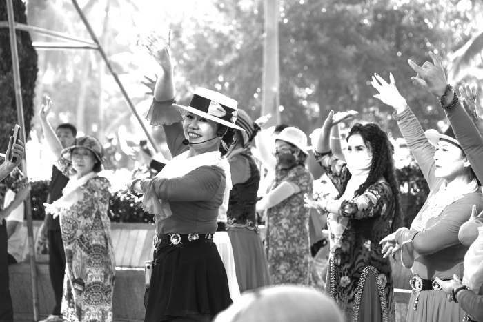 ▲來自全國(guó)各地的“候鳥”文藝愛好者在三亞灣參加群文活動(dòng) 受訪者供圖