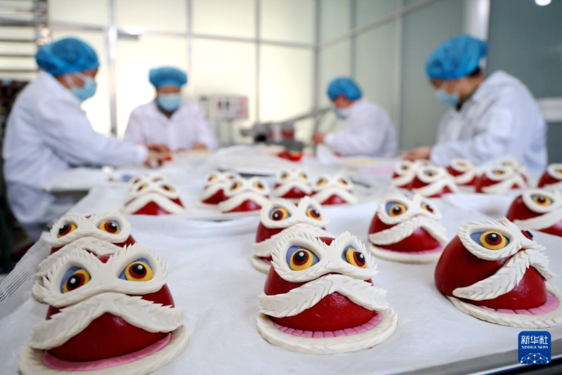 1月22日,在山東省濱州市陽信縣洋湖鄉(xiāng)一家花饃生產(chǎn)企業(yè)車間,工人加緊趕制“醒獅龍”花饃供應(yīng)年貨市場。