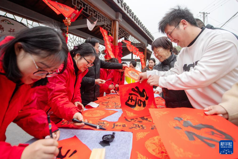1月22日,在浙江省湖州市長興縣泗安鎮(zhèn)太平村文化禮堂外,村民領(lǐng)取“濃濃墨香情,福進千萬家”迎新送?;顒又驹刚邥鴮懙母W帧?/p>