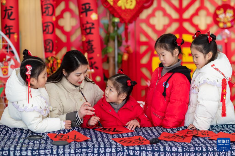 1月22日,在江蘇省興化市昭陽湖幼兒園,老師指導(dǎo)小朋友寫福字。