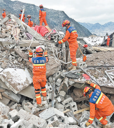 1月22日,救援人員在云南昭通市鎮(zhèn)雄縣涼水村進(jìn)行搜救。 王 姣攝(人民視覺)