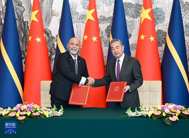 1月24日,中共中央政治局委員、外交部長王毅在北京同瑙魯外長安格明舉行會談并簽署《中華人民共和國和瑙魯共和國關(guān)于恢復(fù)外交關(guān)系的聯(lián)合公報(bào)》。新華社記者 申宏 攝