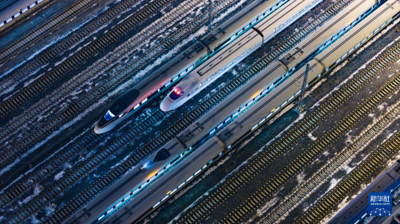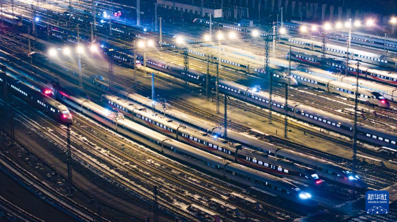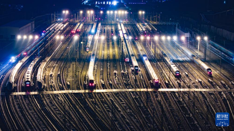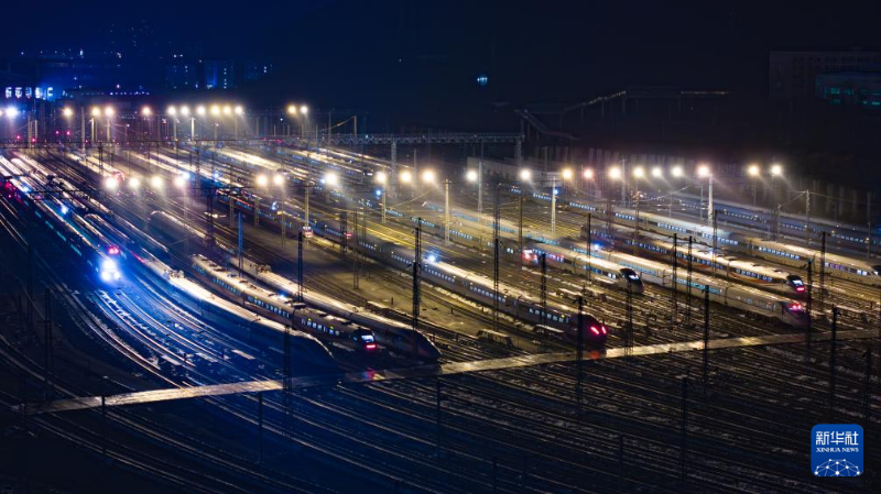 這是1月25日凌晨在貴陽北動車所拍攝的動車組列車(無人機照片)。