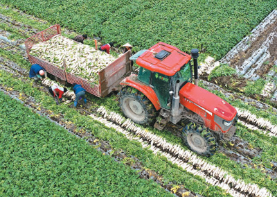 春節(jié)臨近,四川省南充市蓬安縣當(dāng)?shù)剞r(nóng)民搶抓銷售旺季,做好蘿卜、青菜、花菜等蔬菜的采收、銷售,保證節(jié)日市場供應(yīng)。圖為菜農(nóng)們在蓬安縣錦屏鎮(zhèn)中壩社區(qū)萬畝蔬菜種植基地忙著采收蘿卜。周 亮攝(人民視覺)
