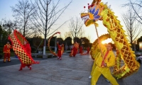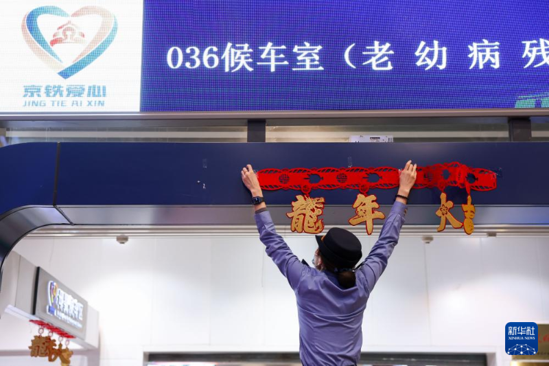 1月26日,在北京西站候車(chē)室,工作人員懸掛“龍年大吉”裝飾。