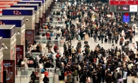 1月26日,旅客在天津?yàn)I海國(guó)際機(jī)場(chǎng)排隊(duì)辦理值機(jī)。