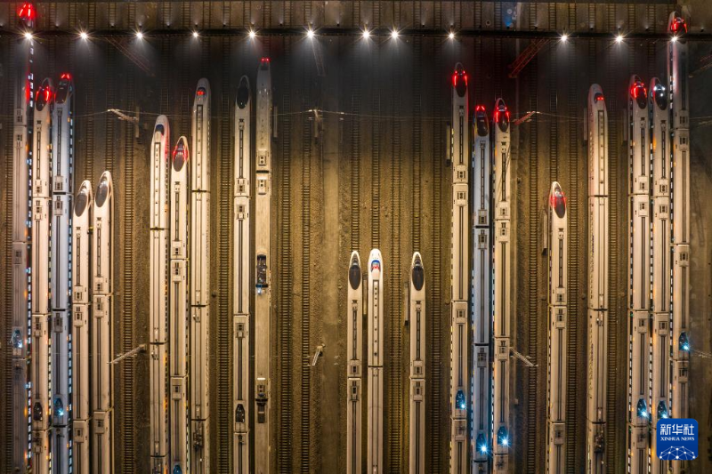 1月26日凌晨,完成檢修的動(dòng)車(chē)組列車(chē)??吭诶ッ鲃?dòng)車(chē)所內(nèi),整裝待發(fā)(無(wú)人機(jī)照片)。