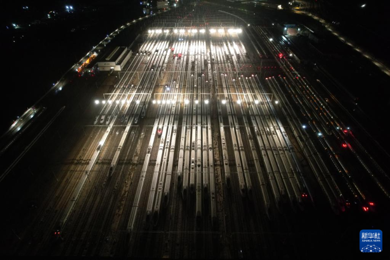1月26日凌晨拍攝的停靠在南京動(dòng)車(chē)段南京南動(dòng)車(chē)運(yùn)用所存車(chē)線(xiàn)上的動(dòng)車(chē)組列車(chē)(無(wú)人機(jī)照片)。