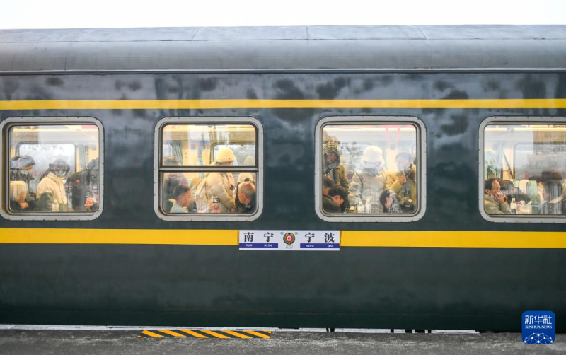 1月26日,在湖南省永州市道縣道州站,乘客在T582次列車(chē)上等候發(fā)車(chē)。
