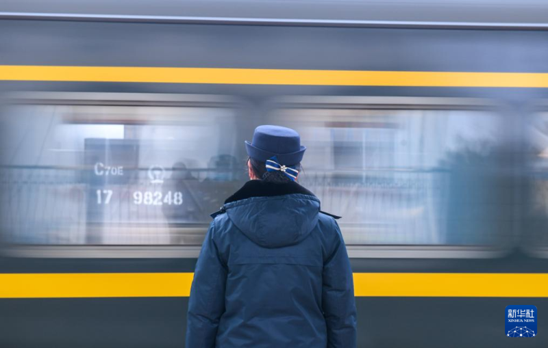 1月26日,在湖南省永州市道縣道州站,工作人員目送T582次列車(chē)發(fā)車(chē)。