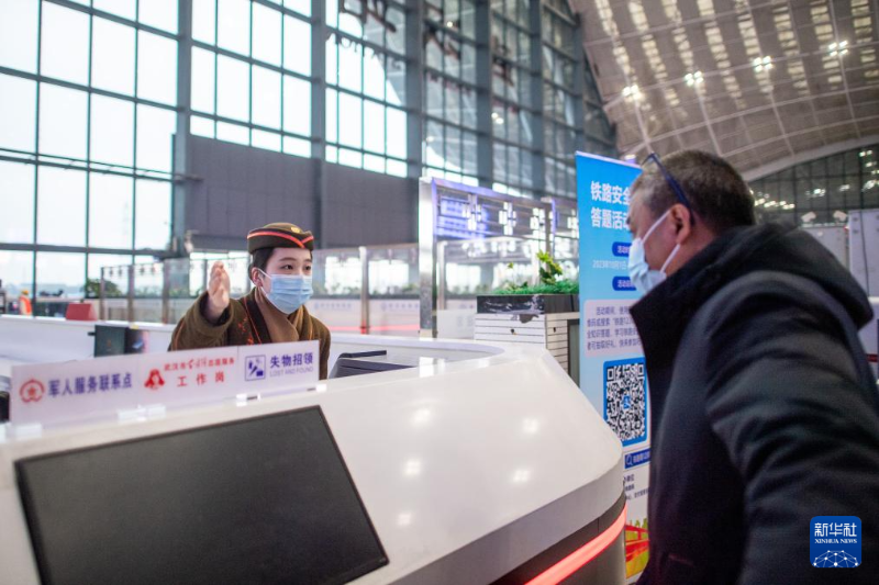 1月26日,在武漢站綜合服務(wù)中心,工作人員為旅客提供咨詢(xún)引導(dǎo)服務(wù)。