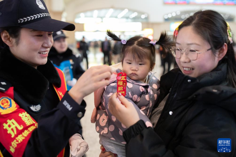 1月26日,在哈爾濱火車(chē)站候車(chē)大廳,哈爾濱鐵路公安局民警為旅客送上禮物。