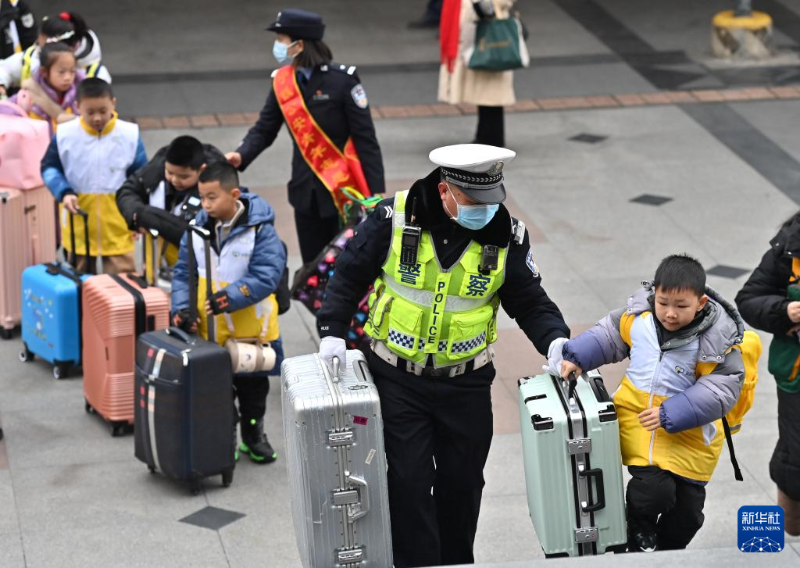 1月26日,民警在廣西南寧火車(chē)站幫助準(zhǔn)備“闖東北”的小旅客進(jìn)站上車(chē)。