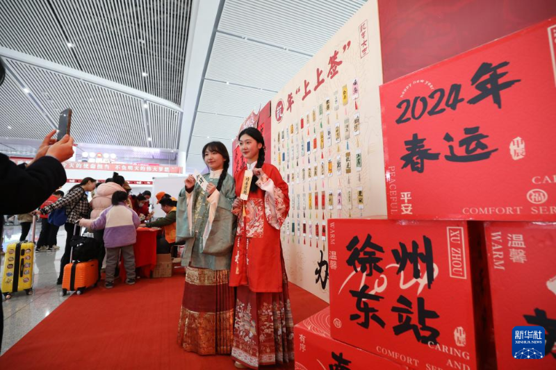 1月26日,旅客在徐州東站候車(chē)大廳身著漢服拍照。