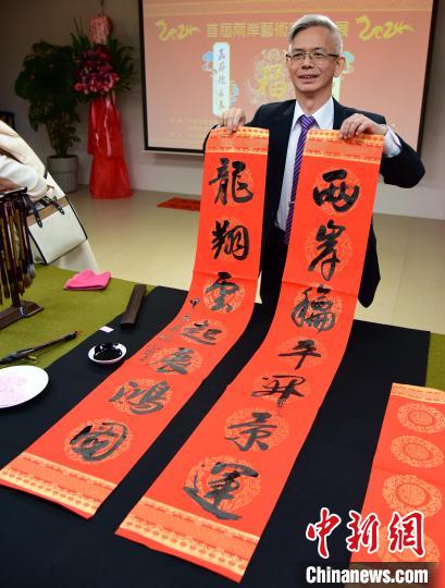 兩岸藝術(shù)名家書寫的對聯(lián)呈現(xiàn)不同的風(fēng)格,有的勁健灑脫、蒼勁挺拔,有的端莊秀麗、清朗爽逸。2024年是中國龍年,藝術(shù)家們對帶有“龍”字的春聯(lián)尤為鐘愛。參展作品中,一半以上帶有“龍”字。大陸書法家吳雪、秦金根不約而同地書寫了“龍年呈國瑞、春日溢華光”;臺(tái)灣中華書道學(xué)會(huì)理事長楊旭堂更當(dāng)場揮毫寫下“兩岸和平開景運(yùn),龍翔云起展鴻圖”,表達(dá)對兩岸關(guān)系和平發(fā)展的期待。