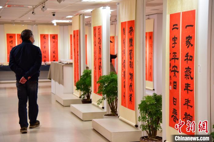 1月28日,兩岸藝術(shù)家春聯(lián)展在臺(tái)北江山如此多嬌藝術(shù)館舉行,32位臺(tái)灣藝術(shù)家、13位大陸藝術(shù)家的90多幅作品參展。圖為現(xiàn)場展出的春聯(lián)作品。中新網(wǎng)記者 路梅 攝