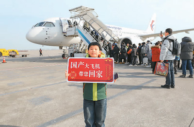 1月26日,在上海虹橋機(jī)場(chǎng),一位小旅客手舉標(biāo)語(yǔ)牌在國(guó)產(chǎn)大型客機(jī)C919前合影。這是C919首度服務(wù)春運(yùn)。