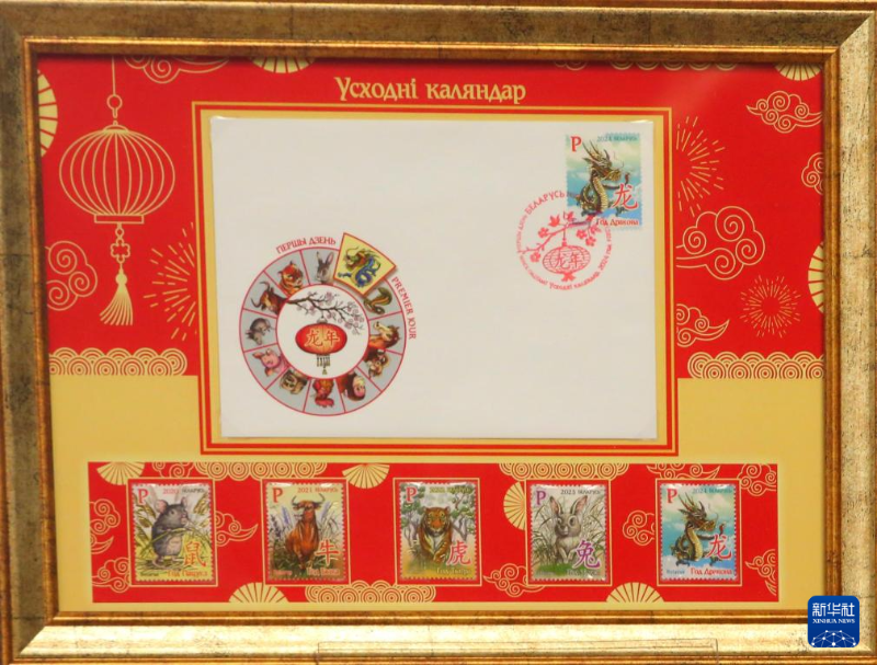 這是1月30日在白俄羅斯明斯克拍攝的《東方歷法:龍年》郵票和首日封,以及發(fā)行的該系列以往郵票。 新華社發(fā)(任科夫 攝)