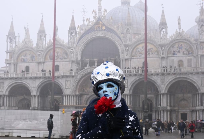1月27日,戴著面具的演員在意大利威尼斯圣馬可廣場留影。新華社發(fā)(阿爾貝托·林格利亞攝)