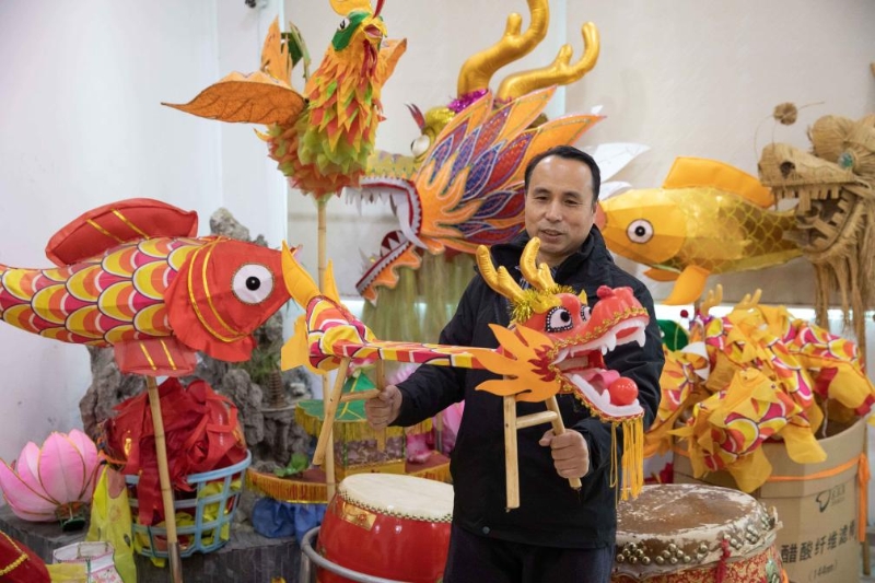 1月30日,南昌市青云譜區(qū)城南龍燈工廠,城南龍燈傳承人史克濱展示為兒童設(shè)計(jì)生產(chǎn)的小板凳龍。新華社發(fā)(孫睿澤攝)