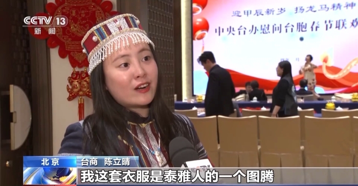 臺商 陳立晴:我這套衣服是泰雅人的一個圖騰,是以一個旗袍的樣式去做的,想要表達的就是兩岸一家親,我們都是一家人。我們也盼望和平,能夠和平地交流,熱于交流。(央視新聞客戶端)