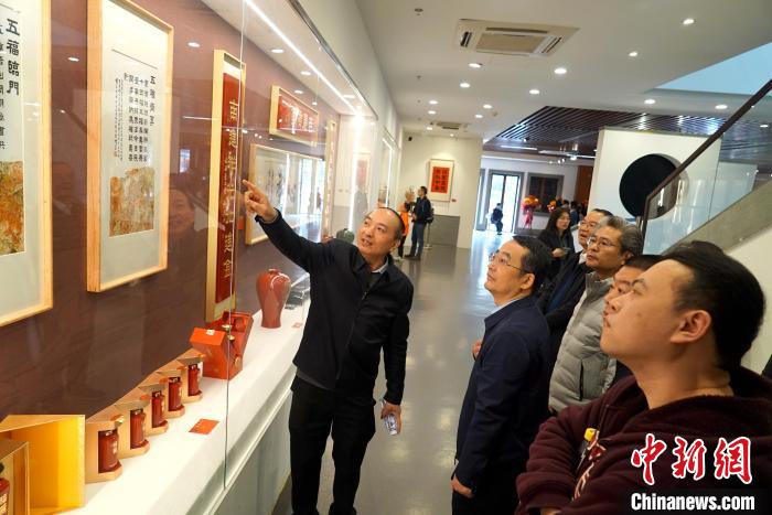 2月3日,“福語吉言——陳吉書法藝術(shù)作品展”在福州三坊七巷開幕,書法家陳吉(左一)向參觀者介紹文創(chuàng)作品《五福齊享》。張祥成 攝