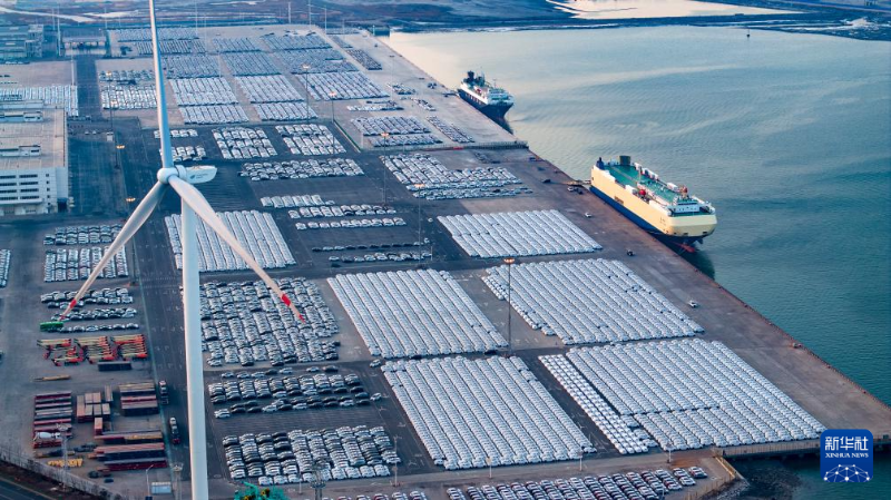 2月3日,汽車整齊排列在天津港海嘉滾裝碼頭(無人機照片)。