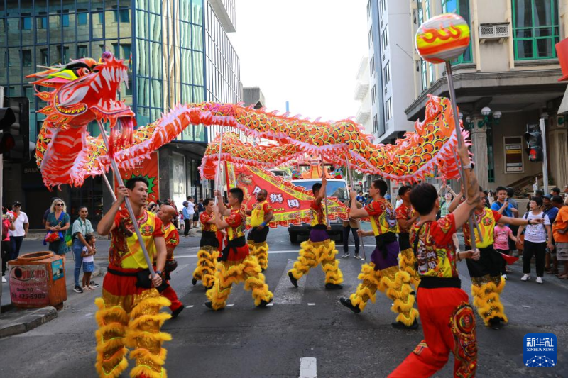2月3日,在毛里求斯首都路易港,參加2024“歡樂春節(jié)”花車巡游活動(dòng)的演員進(jìn)行舞龍表演。