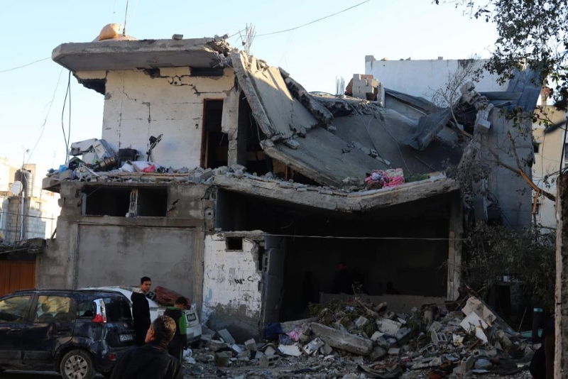 2月3日,在加沙地帶南部城市拉法,巴勒斯坦人查看以軍空襲后的建筑廢墟。新華社發(fā)(哈立德·奧馬爾攝)
