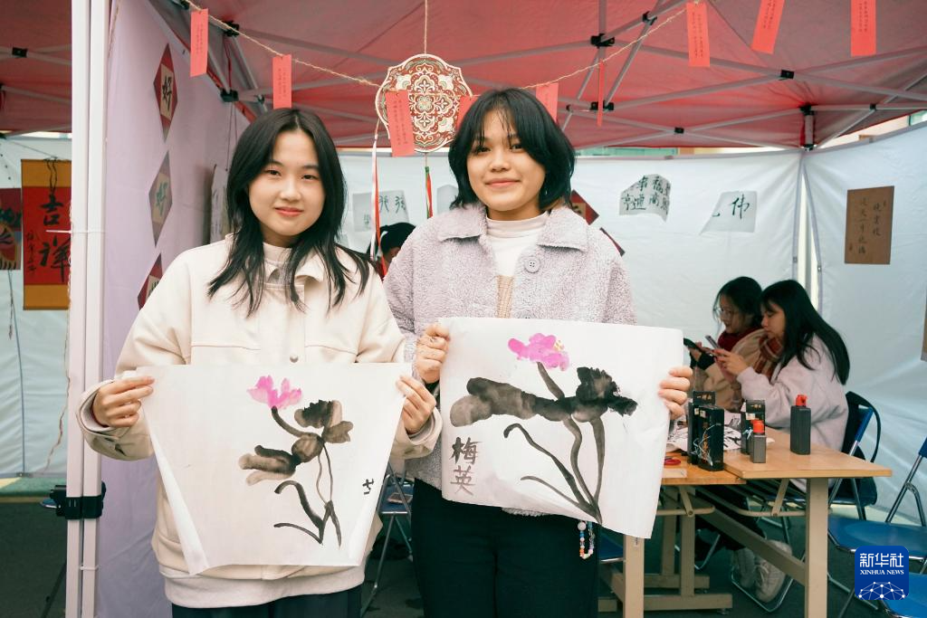 1月24日,“歡慶春節(jié)暨中越年俗文化交流體驗”活動在越南河內(nèi)的河內(nèi)大學(xué)舉辦,約500名學(xué)生及社會各界人士參加了書法、中國畫、剪紙、奧黛漢服秀和歌舞表演等體驗活動,還品嘗了春卷、粽子、餃子、湯圓等傳統(tǒng)美食。這是兩名越南學(xué)生在活動中展示自己繪制的中國畫作品。新華社記者 胡佳麗 攝