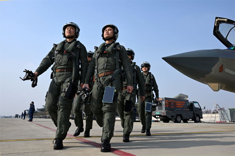 空軍航空兵某旅飛行一大隊(duì)飛行員完成準(zhǔn)備走向訓(xùn)練場(chǎng)(2023年12月20日攝)。新華社發(fā)(余紅春 攝)