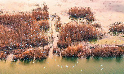江蘇省宿遷市泗洪縣洪澤湖濕地溧河洼臨淮段,白鷺在空中盤(pán)旋飛舞。張連華攝(人民圖片)